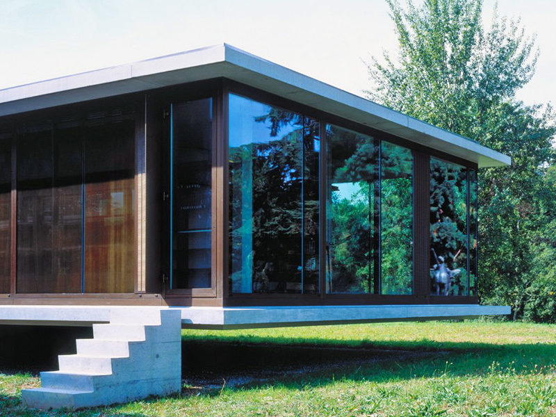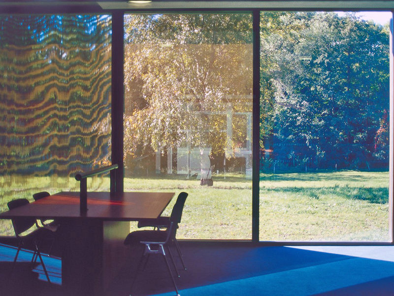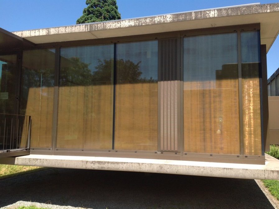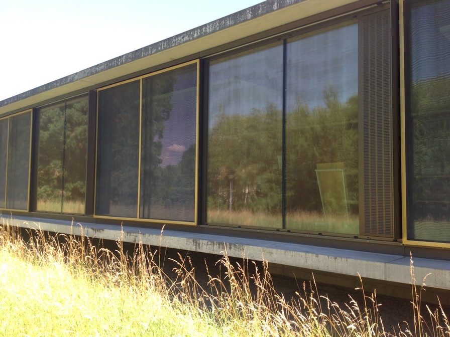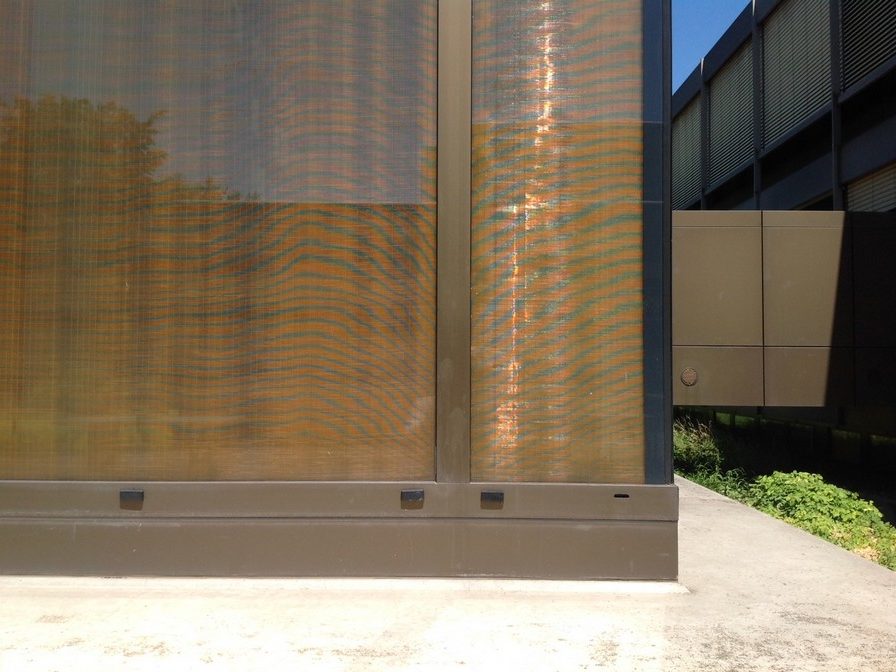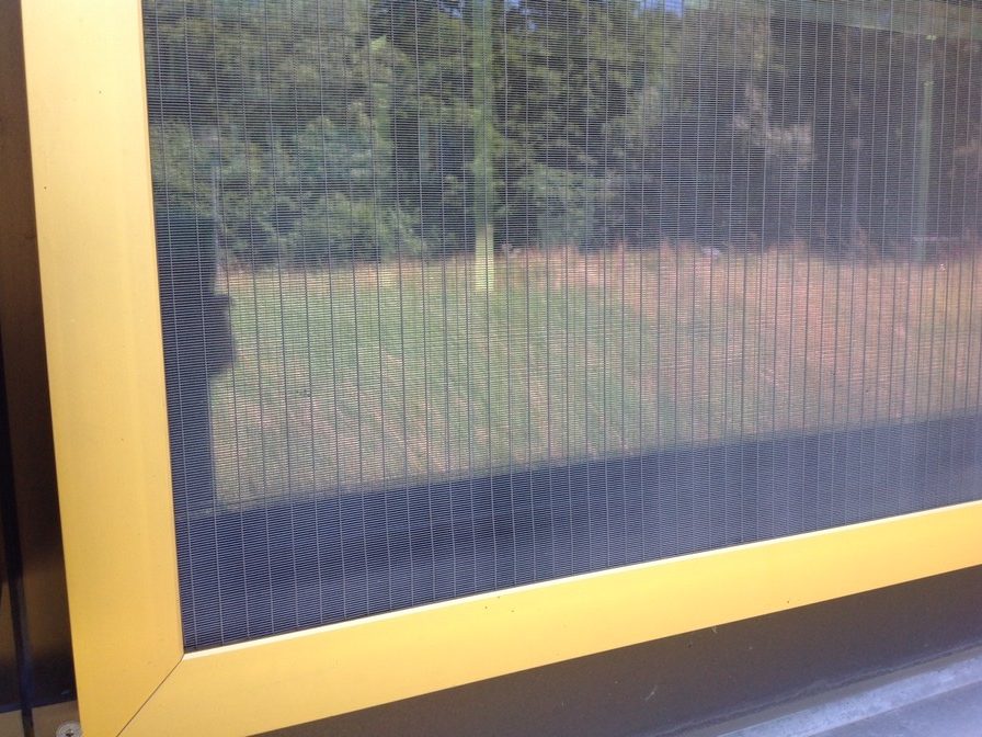 Installation de Koolshade bronze. Encadrement en aluminium anodisé bronze combiné avec du Koolshade de la même couleur..